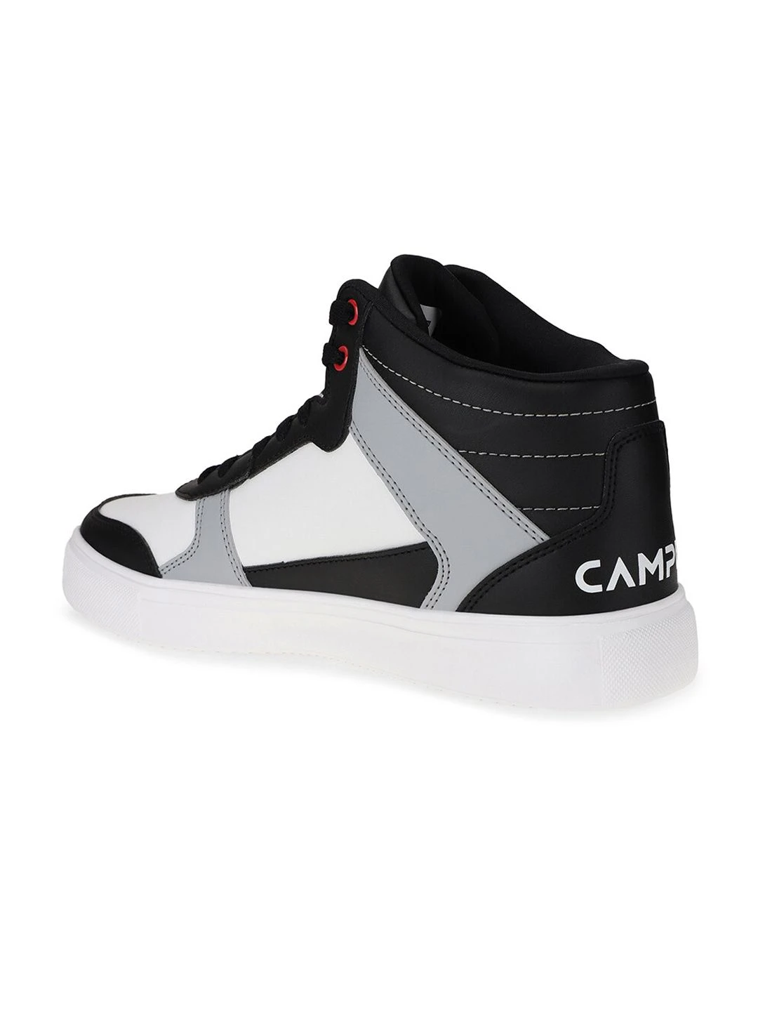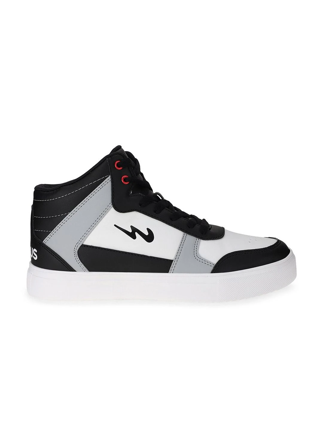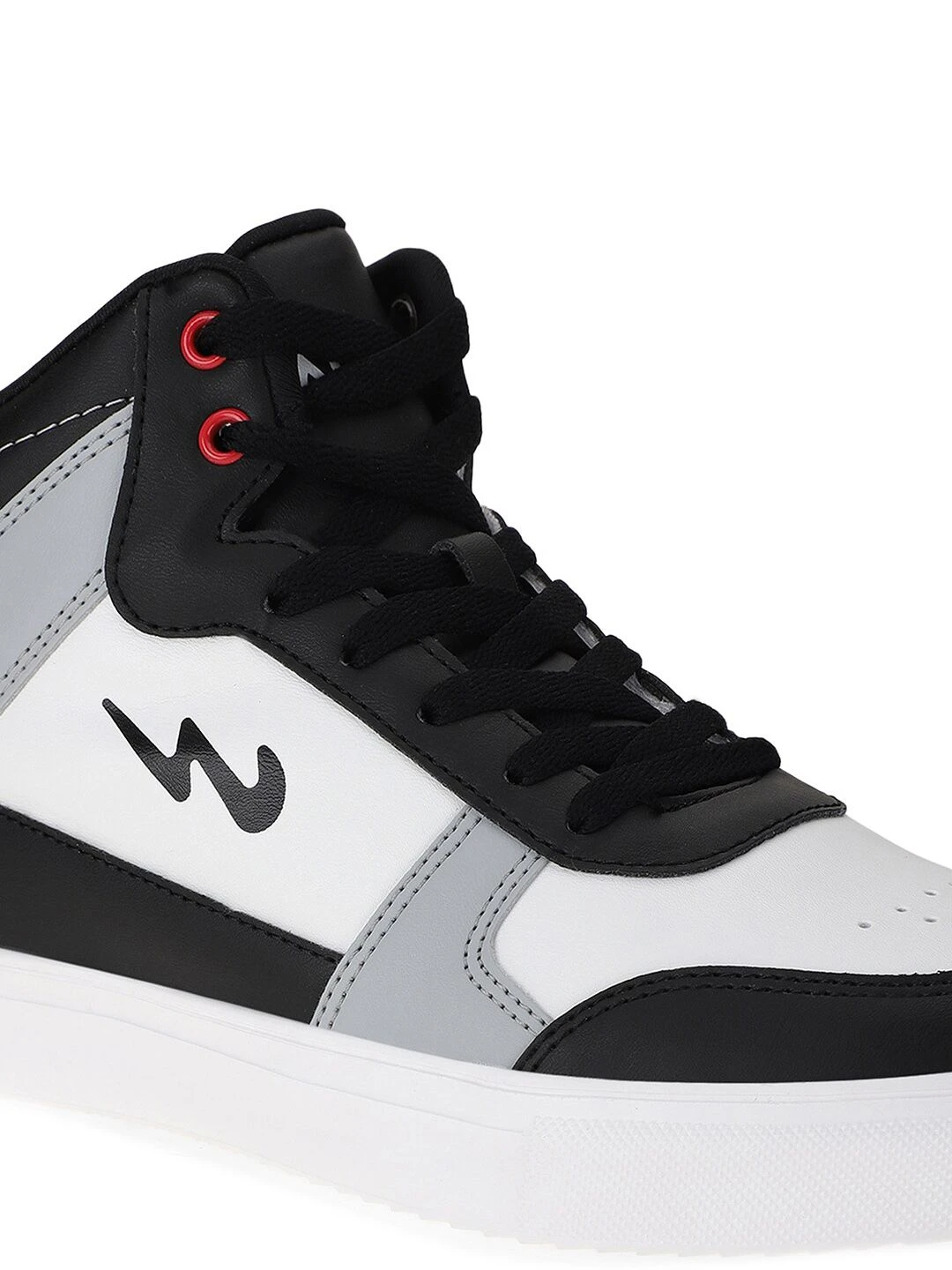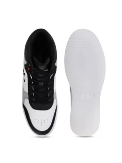 A pair of round toe black,white and grey sneakers ,has mid-top styling