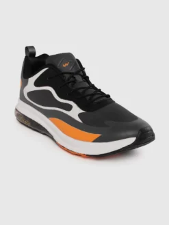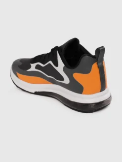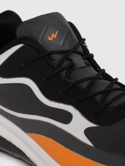 A pair of charcoal grey, white and orange running shoes, has regular styling, lace-up detail