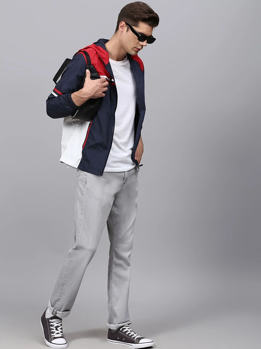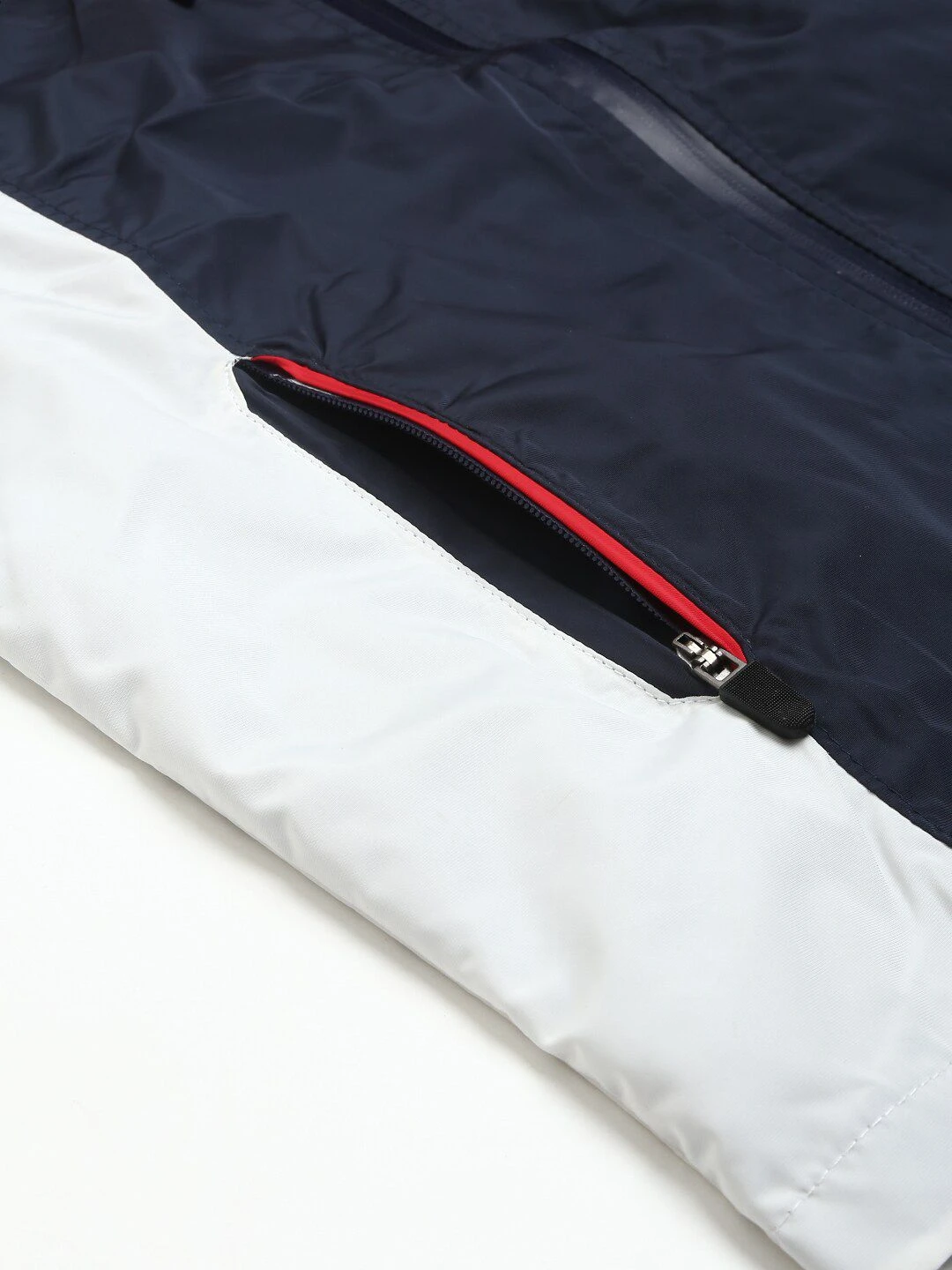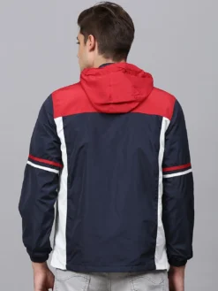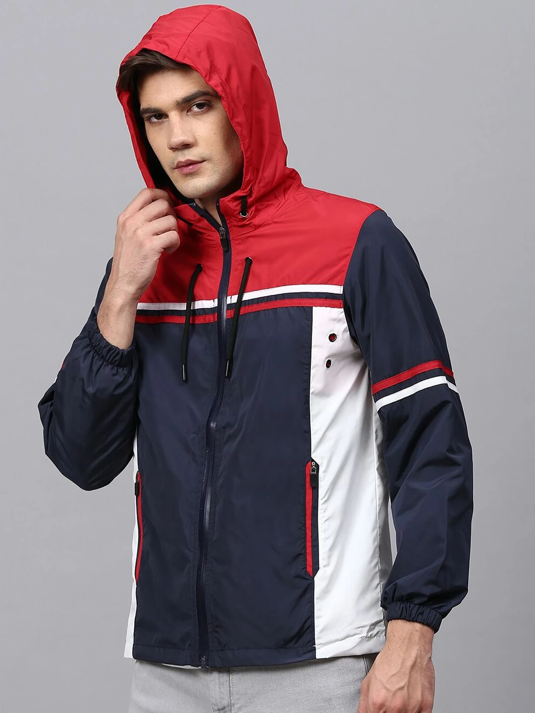 Blue colourblocked windcheater sporty jacket with zip detail, has a hooded, 2 pockets ,has a zip closure, long sleeves, straight hemline, polyester liningThe model (height 6′) is wearing a size M