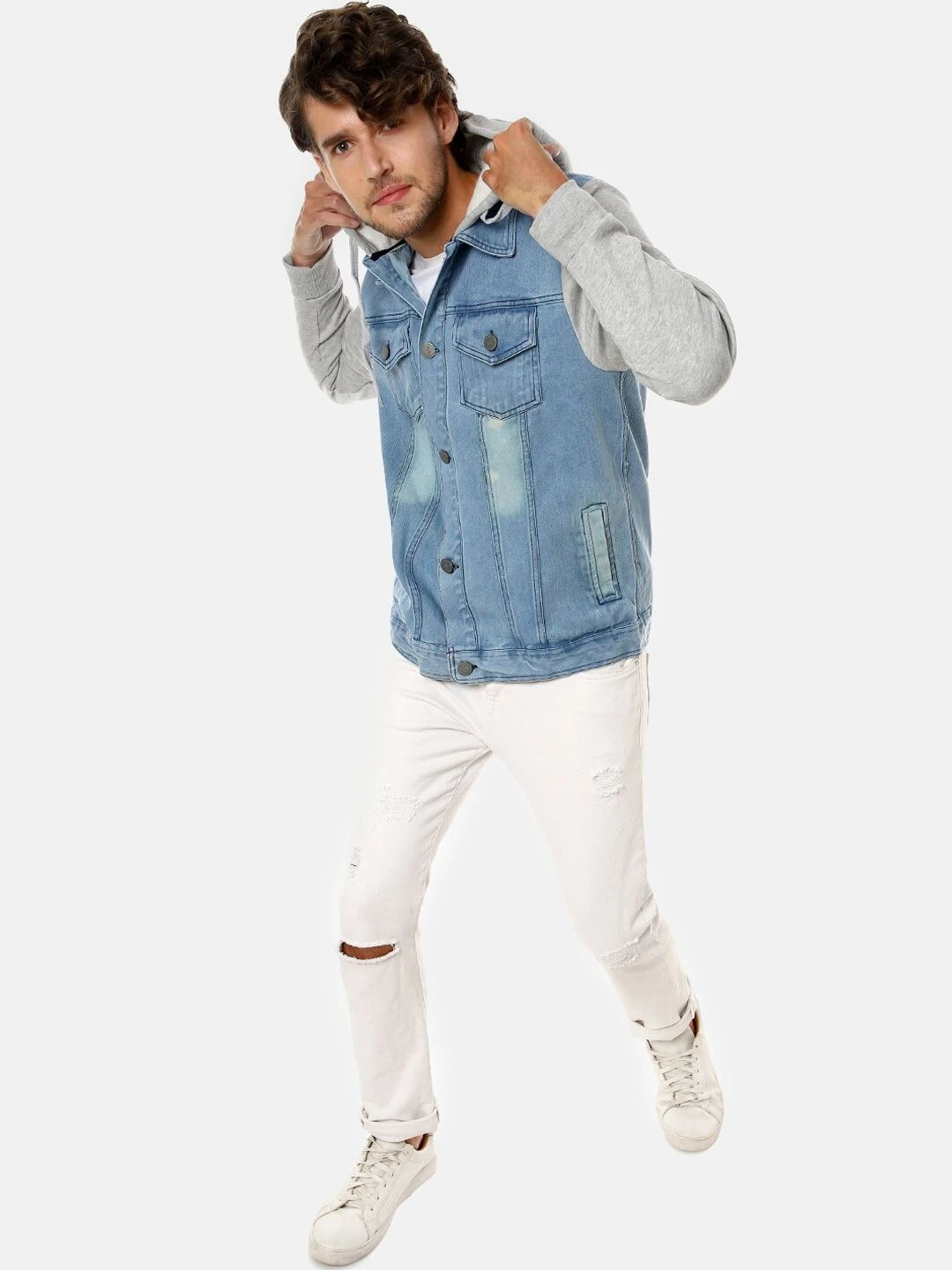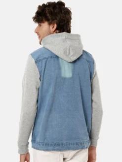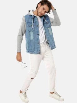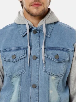 Blue washed colourblocked windcheater denim jacket with faux fur trim, has a hooded, 4 pockets ,has a button closure, sleeveless, straight hemline, cotton liningThe model (height 6′) is wearing a size MOuter shell: Cotton