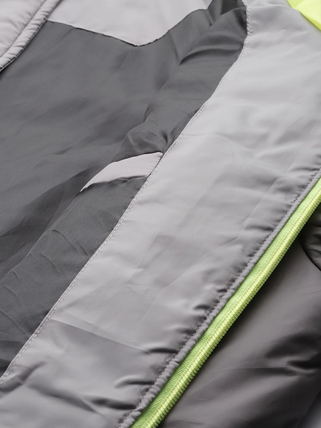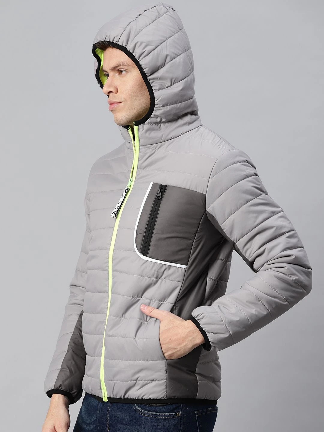 Grey and Black colourblocked jacket, has a hooded, 3 pockets, zip closure, long sleeves, straight hem, and polyester liningThe model (height 6′) is wearing a size MThis fashionable grey jacket will elevate your overall style. This jacket from Campus Sutra can be worn with distressed denims and a modern tee for a laid-back brunch outfit.Material: Polyester